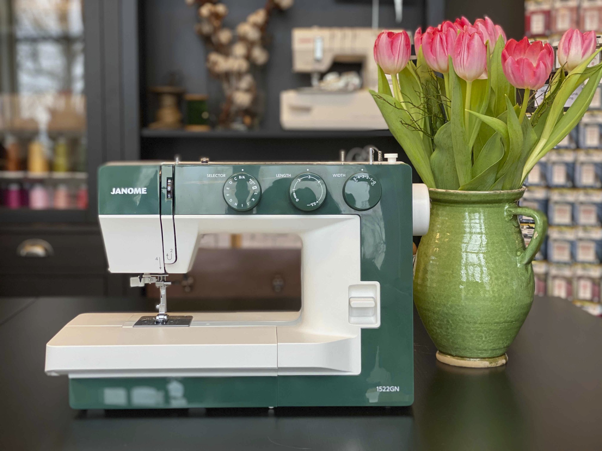 På den rosa maskinen følger det med ekstra spoler, en liten trådsaks, en pakke med washitape til dekorasjon, nålepute – alt kommer i en liten snørepose.